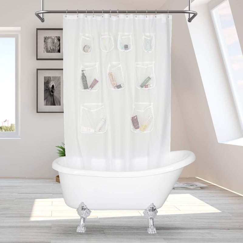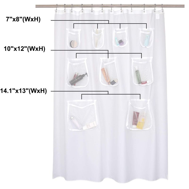 - Mesh Pockets Bath Organizer: Keep your favorite shower accessories close at hand with this shower curtain with 9 pockets