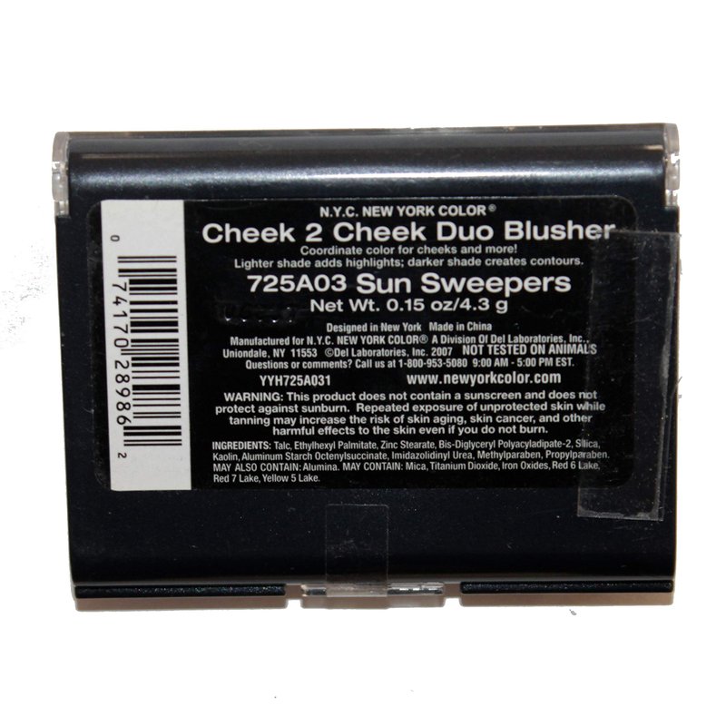 (1) N.Y.C. Compact Cheek 2 Cheek Duo Blusher. Highlights & Contours. Two Shade Makeup Palette. #725A03 Sun Sweepers. Net Wt. 0.15 oz / 4.3 g. Lighter shade adds highlights, darker shade creates contours.