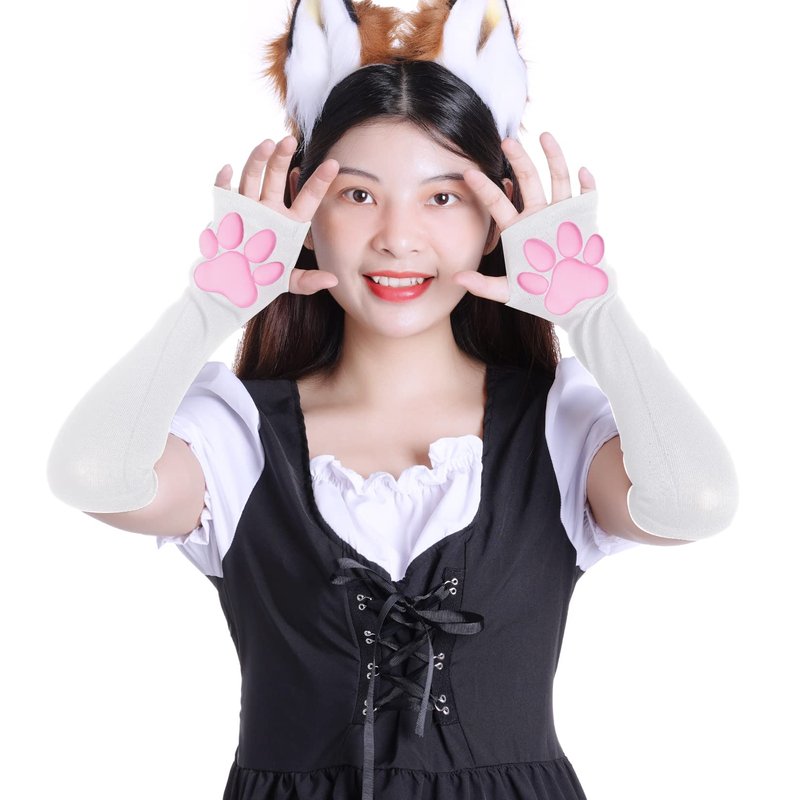 Nydotd Cat Paw Pad Mittens Gloves Kawaii Pink 3D Claw Fingerless Cute Cat Cosplay Gloves Sleeve for Girls Halloween Party (White, Long)