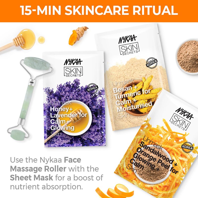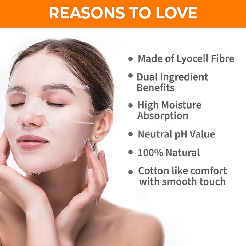 - Brightening and Soothing Effect: The facial sheet mask restores the skin's brightness and soothes irritation. The unique blend of Sandalwood and Orange in our formula helps in achieving an ethereal glow.