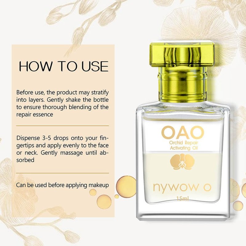 Our skincare marvel offers a 2-in-1 experience, seamlessly blending Orchid Oil and Orchid Repair Activating Essence. This innovative product not only shines as a skincare gem but also doubles as a highly efficient makeup primer. A quick shake merges the dual layers, delivering deep moisturization, intense hydration and revitalization effect. The water-in-oil crystal form ensures active essence penetrates deeply, setting a new standard in light oil skincare, surfactant-free. Hydrate, soothe, and refresh your skin with our specially crafted formula. It calms sensitive skin through deep hydration, layer-by-layer replenishment, and a light, non-greasy texture, leaving your skin radiant and oil-free. The unique oil-water texture seamlessly blends, providing a dual essence effect that penetrates deep into the skin, effectively soothing sensitivity and revitalizing for a refreshing sensation. Experience the anti-aging wonder of nywow o, where meticulously chosen ingredients reverse the signs of aging, alleviating dryness and wrinkles. The infusion of vitality into your skin diminishes fine lines, imparts delicate elasticity, and ensures a hydrated, plump complexion, revealing the miracle of youthful radiance.