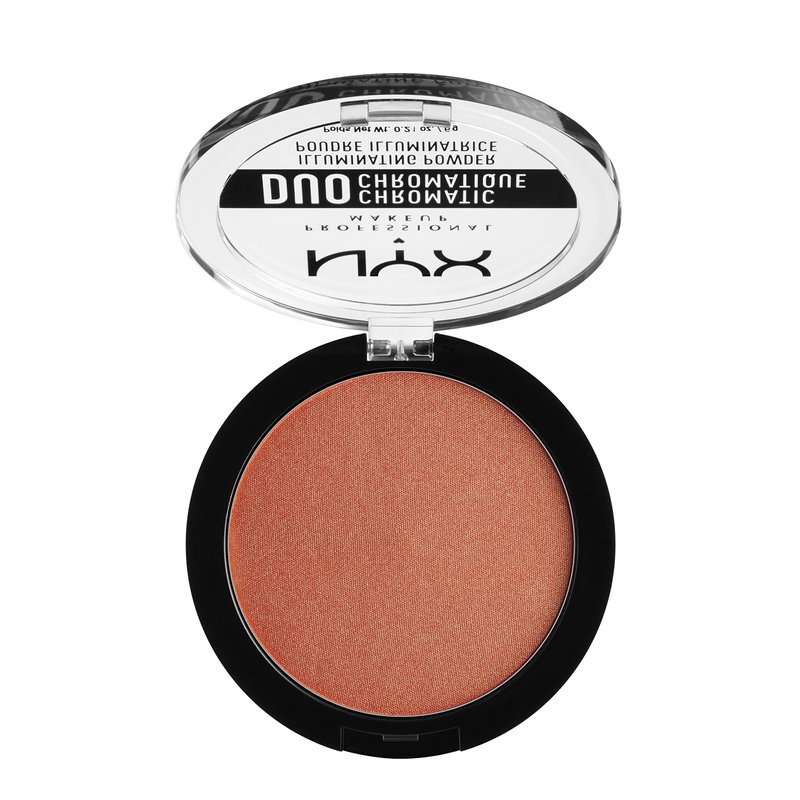 - Powder Highlighter: Light up your features with NYX Professional Makeup Duo Chromatic Illuminating Powder; Available in frosty, glowing highlighter shades, this silky pressed powder highlighter blends like a dream for a lit up look