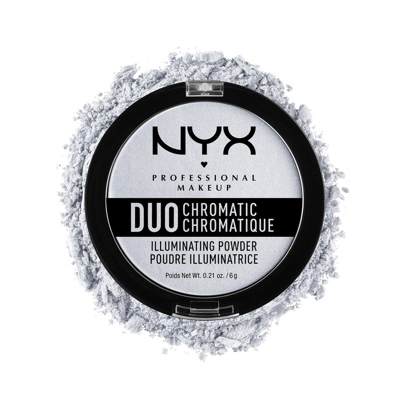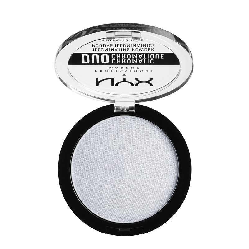 - Powder Highlighter: Light up your features with NYX Professional Makeup Duo Chromatic Illuminating Powder; Available in frosty, glowing highlighter shades, this silky pressed powder highlighter blends like a dream for a lit up look