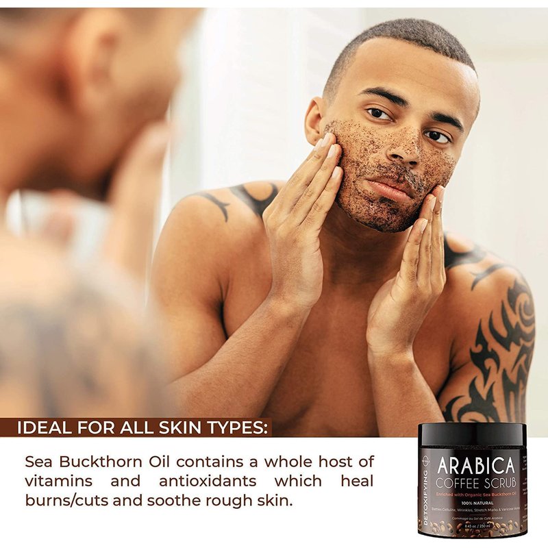 - Exfoliating Body Scrub for Men & Women - This Dead Sea Salt scrub uses the caffeine component of coffee Arabica. Our body polish exfoliates dead skin and hydrates your face, hands, body, booty, and legs. As well as body scrubs for women exfoliation.