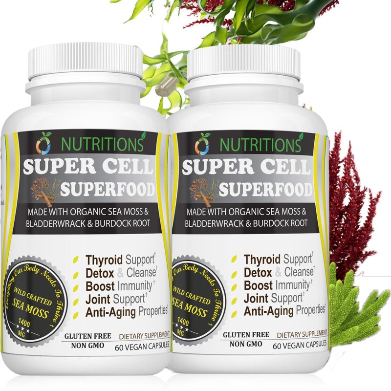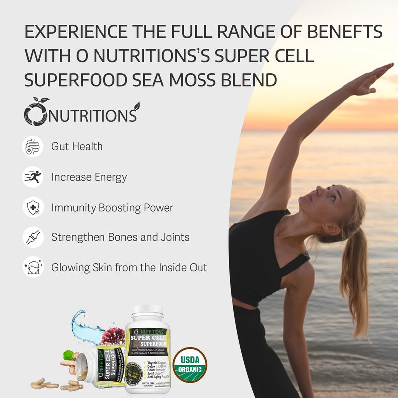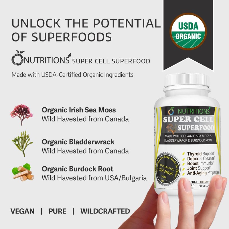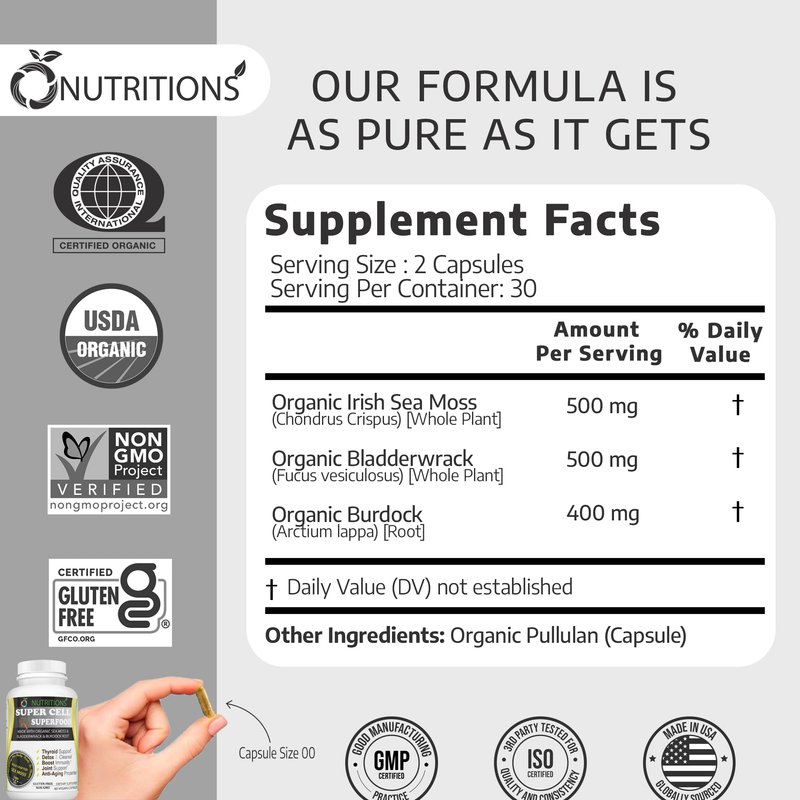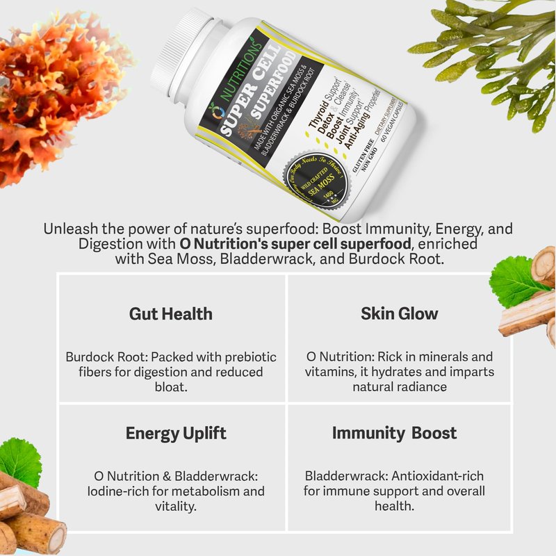 O NUTRITIONS Certified Organic Sea Moss, Super Cell Superfood Made with Organic Irish Sea Moss, Bladderwrack and Burdock Root, Wildcrafted Sea Moss Capsules, Vegan Seamoss Pill