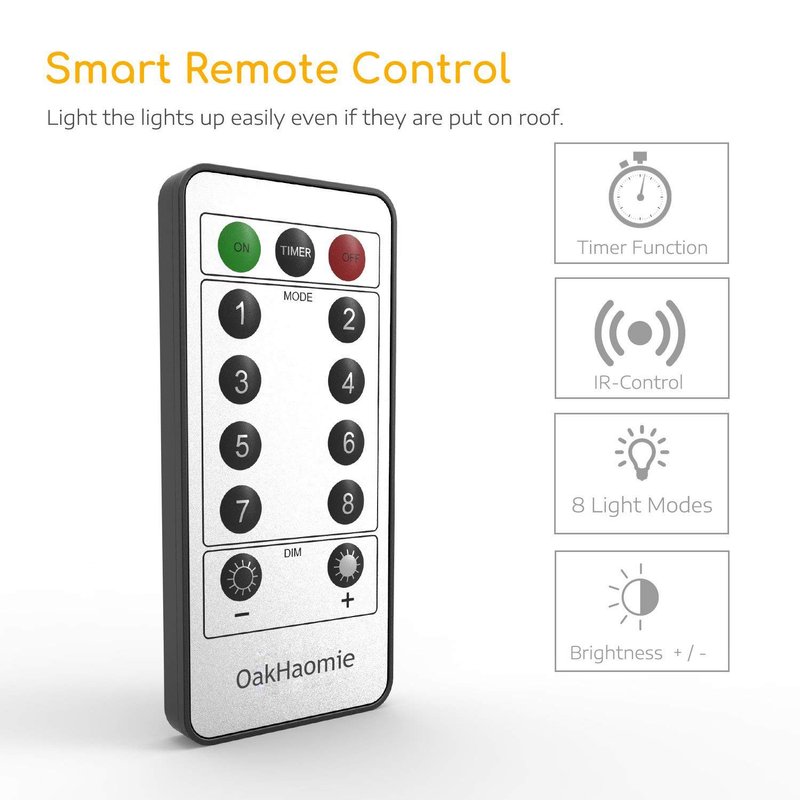 - 【Remote Control& CR2032 Batteries Powered】-OakHaomie fairy lights CR2032 battery operated and 2pcs remote control. One remote control can control one or multiple fairy lights. (NOTE: 1.Please pull out the insulation sheet before using remote. 2.The method of removing and replacing CR2032 is on the back of the remote control.3. When the lighting of the light string is dim, the remote control can't control the light string, so it’s necessary to replace the battery in time.)