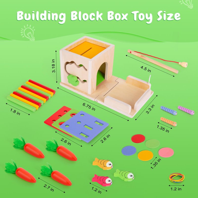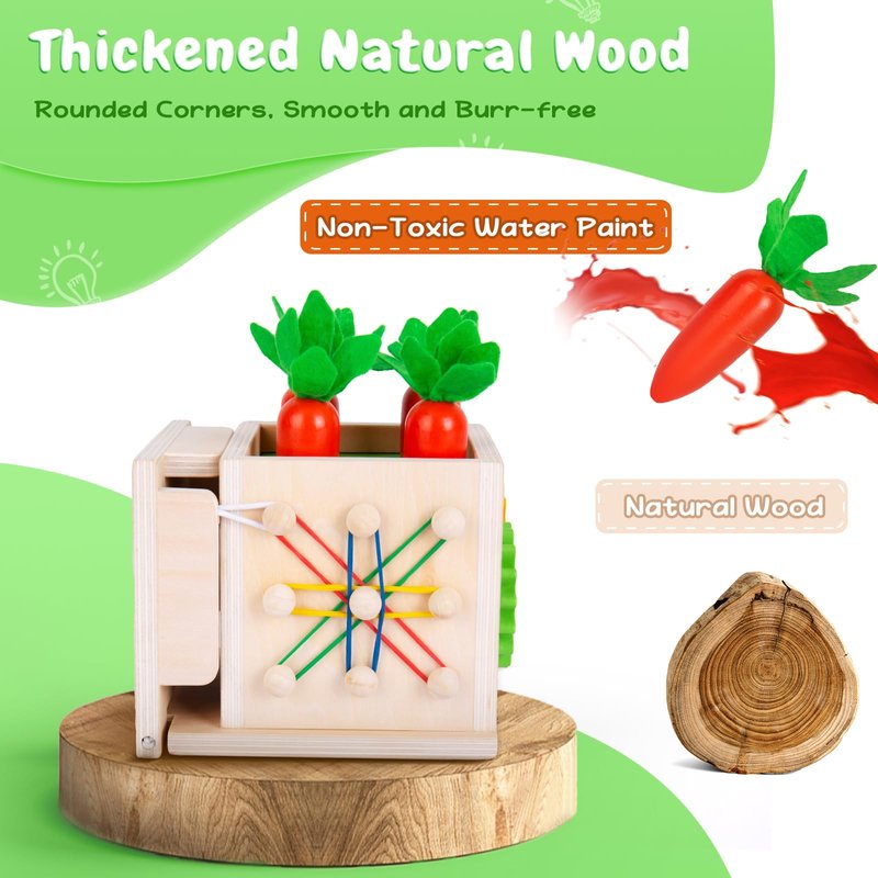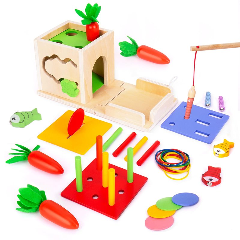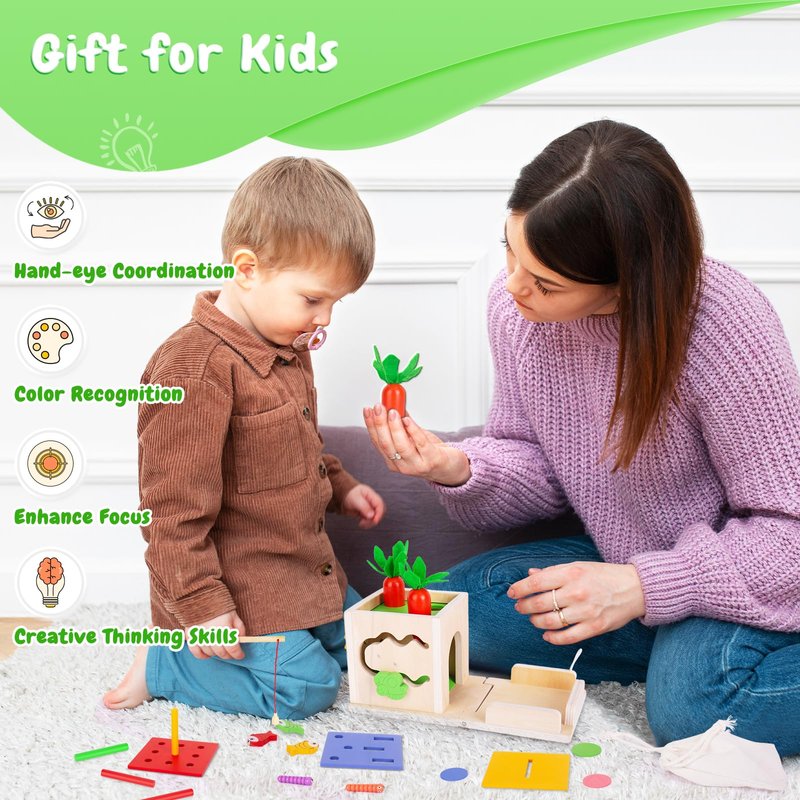 - 8 In 1 Montessori Sensory Toys: Our wooden montessori toys include carrot harvest, catching caterpillars, fishing, track game, coin box, rubber band creation game, sticks drop game and wood gear wheel for infants and toddlers to master various skills in rich early education games