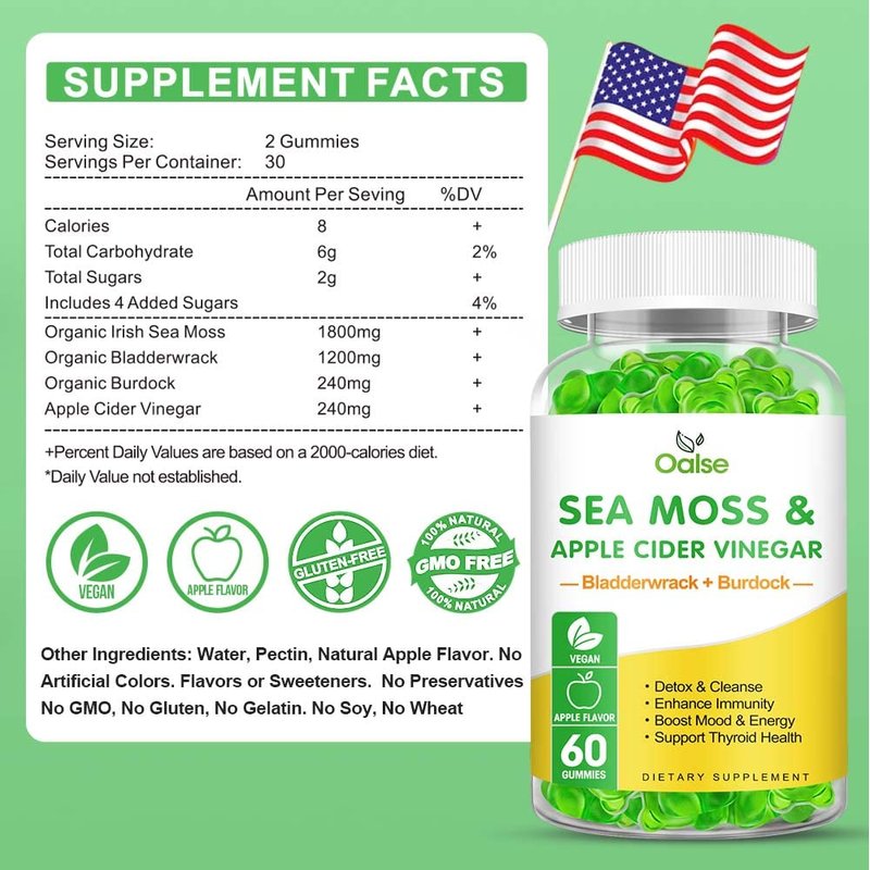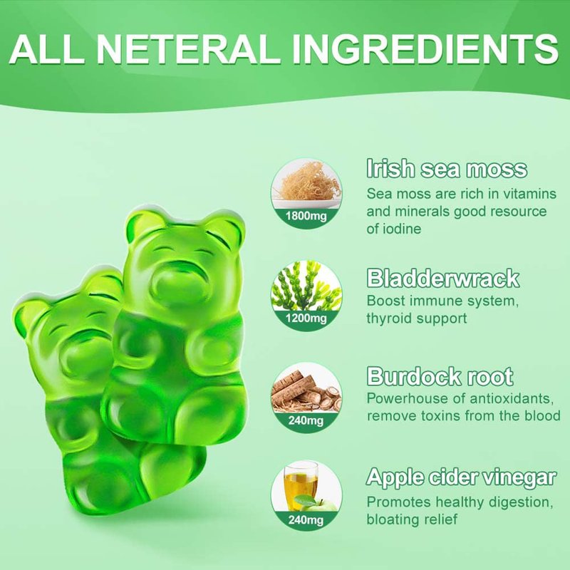 - ✨【Patented Formula】1800mg Irish sea moss + 1200mg bladderwrack + 240mg burdock root + 240mg apple cider vinegar, all from natural organic raw, based on sea moss gel to make seamoss gummies bears, help deliver 102 vitamins and minerals that the body needs.