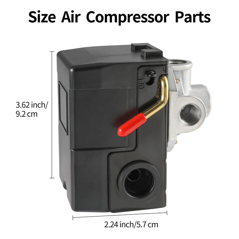 - 【Convenient to Use】: The Four-port Manifold Gives You the Flexibility to Mount the Switch. The four-port Manifold Gives You the Option to Mount in it Any Direction and to Also Have the Option to Add a Relief Valve, Gauge, or Multiple Air Outlet Ports. The Switch is Preset to Turn on the Compressor at 95 PSI and Turn off the Compressor at 125 PSI.