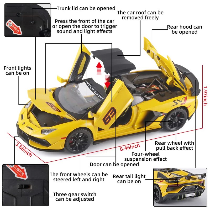 - 3.Yellow Lambo SVJ 63 Toy Cars Features:With simulated sound and light effects,there are three gear switches at the bottom of the car that can be adjusted. After adjusting to the open gear,Press the front of the car or open the door to trigger the sound and light effect.The doors can be opened,The trunk lid and hood can also be opened,the car roof is freely removable.The front wheels can turn left and right,four wheels with shock absorbing effect,the rear wheel has a pull-back function.