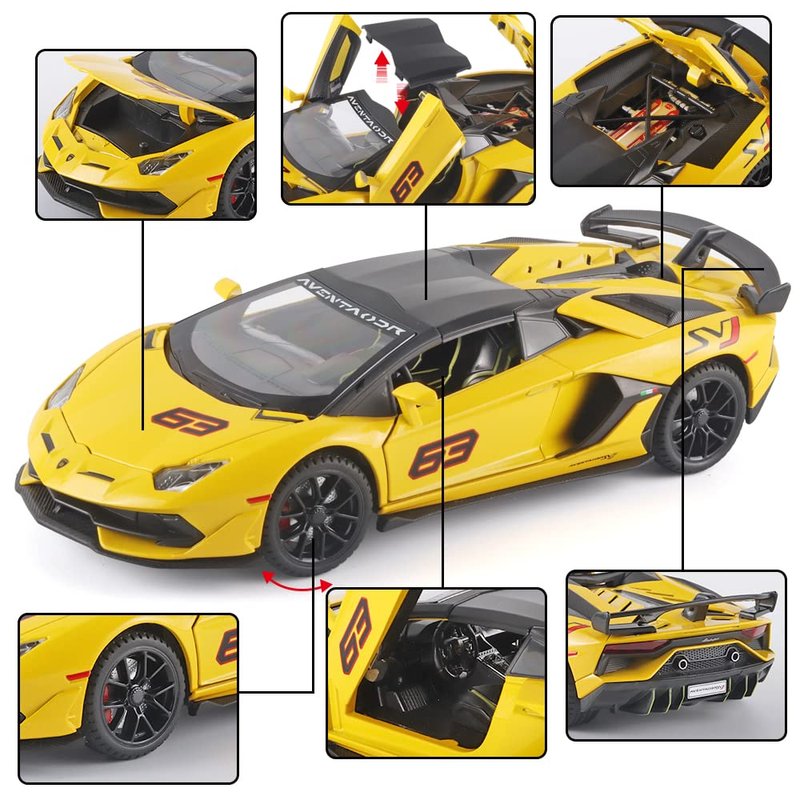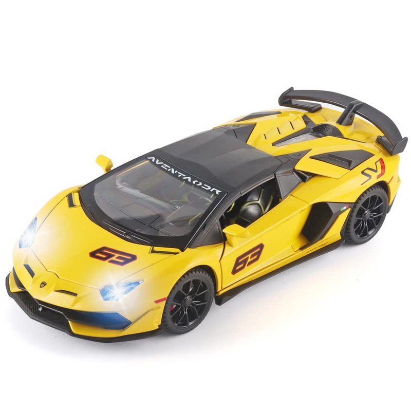 - 4.Yellow Lambo SVJ 63 Toy Cars Display:This Lambo SVJ 63 alloy die-cast toy cars has fine workmanship and rich details,which can decorate men's offices and boys' rooms, and is very suitable for car model lovers to collect. It is an excellent choice for play, preschool education, decoration and collection.
