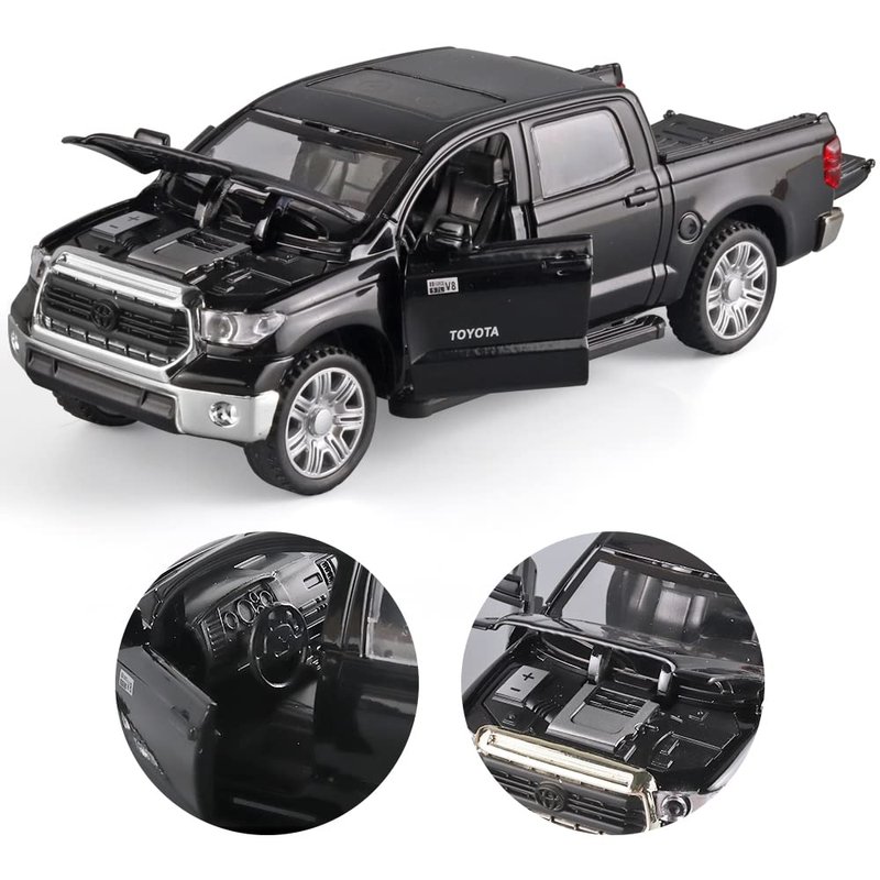 - 4.Black Tundra Pickup Truck Model Display:This alloy die-cast toy pickup truck has fine workmanship, can decorate men's offices and boys' rooms, is very suitable for car model lovers to collect, and is an excellent choice for play, preschool education, decoration, and collection.