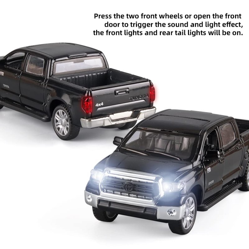 - 3.Black Tundra Pickup Truck Features:With sound and light function, press the two front wheels or open the front door to trigger sound and light,Both front doors, hood and tailgate can be opened,Both front lights and rear tail lights can be illuminated,The rear wheel of the toy pickup truck has a pull-back function.