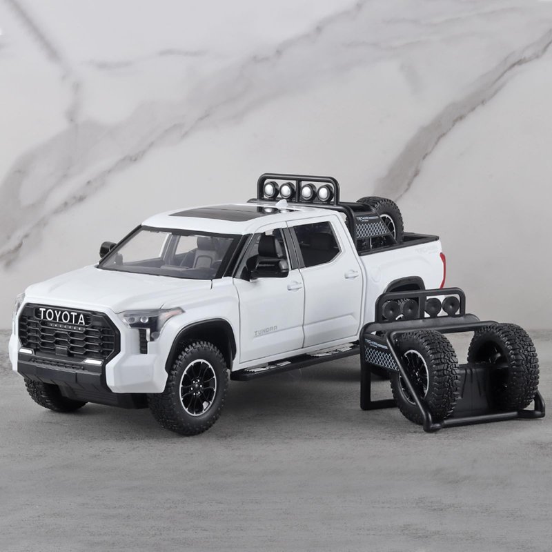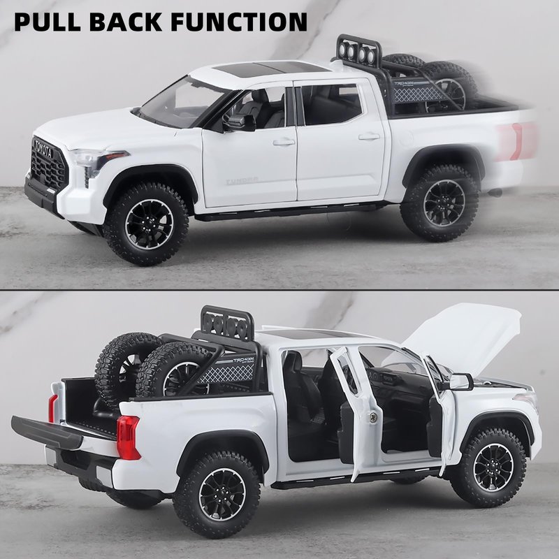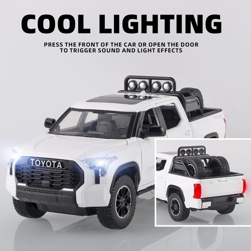 Tundra Toy Trucks is made of zinc alloy + ABS plastic, and the zinc alloy body, interior and chassis are all ABS plastic.With simulated sound and light effects,press the body or press the steering wheel to trigger the sound and light effect,the front lights and rear tail lights light up and trigger the sound effect.Doors, hood and tailgate all open,front wheels can turn left and right,the rearview mirror can be folded,retractable pedals on both sides,the tire rack can be freely disassembled.Four wheels with shock absorbing effect,the rear wheel has a pull-back function.Tundra toy pickup truck fine workmanship,very suitable for collection by children or car model lovers, and is the best choice for gift giving.