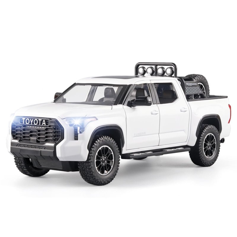 - 4.White Tundra Toy Trucks Display:Tundra metal diecast toy trucks is finely crafted and rich in details,which can decorate men's offices and boys' rooms, and is very suitable for car model lovers to collect. It is an excellent choice for play, preschool education, decoration and collection.