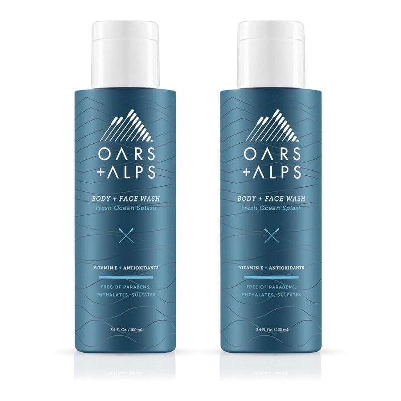 Oars + Alps Mens Moisturizing Body and Face Wash, Skin Care Infused with Vitamin E and Antioxidants, Sulfate Free, Fresh Ocean Splash, Travel Size 3.4oz 2 Pack