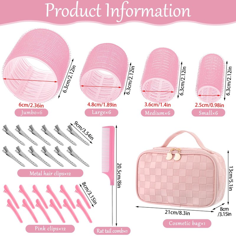 SpecificationsMaterial: plasticColor: pinkSize: Jumbo 2-3/8 inches, large 1-7/8 inches, medium 1-3/8 inches, small 1 inchesFeatures:1. Self Grip hair rollers are not recommended for people with very fine, thinning or hard hair. Also, please confirm the size before purchasing.2. How to use: First wash your hair, then blow dry with a hair dryer until your hair is 80% dry and slightly damp. Then use comb to part your hair and comb a section of hair that is smaller than the width of the curling barrel; slowly roll up the ends of the hair and secure it with a clip. After that, dry your hair thoroughly with a hair dryer, and then gently remove the curling barrel after your hair has cooled. Instead of combing your hair, use hair oil or wax to style it.Package Include: 24pcs rollers for long hair, 24 pcs hair clips,1 hair comb and a makeup bag