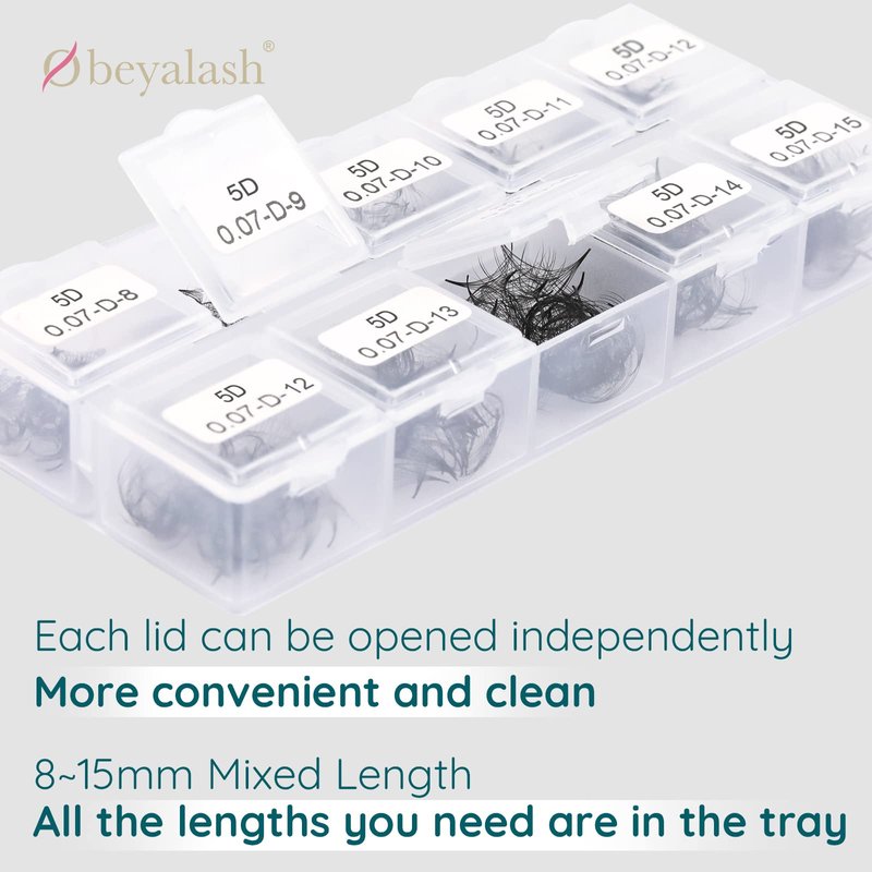Obeyalash offer promade fans in 3D~11D 0.07mm thickness C/D curl 8mm~17mm length. You can use Obeya Promade fans to create every lash style. Your clients can get great results with different lengths. Obeya Promade lash fans handcrafted by skilled lash artist, lash fans are symmetrical and evenly spaced. Tiny adhesive bases are used for best bonding results, very lightweight. The Loose Fans Lash Extensions offer a much more genuine lasting experience and look. Promade Fans Lashes come in a box of 1,000 fans (only 3.5 cents per fan). 1000 (+1%) loose fans, the amount is correct. 8.3 times the amount of normal 12 rows lash trays. That's enough to serve 6-9 clients. This lash tray offers unbeatable value for the price. 8mm~17mm mixed length in one tray, a lot more cost effective than having to buy each length separately. Loose fans lash extensions are easier to use while working compared to normal tape lash trays. You can quickly pick up and apply eyelash fans with tweezers,the Promade fans are not attached to the tape, the premade fans won’t fall apart, moreover eyelashes are clean without residue.