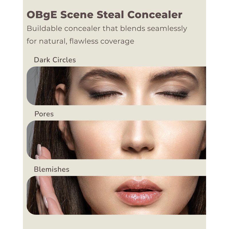 - OBGE SCENE STEAL CONCEALER LIGHT BEIGE - Get flawless, smooth skin with OBgE Scene Steal Concealer. This liquid concealer is perfect for hiding fine lines, blemishes, dark circles, and imperfections, leaving you with a natural-looking finish.