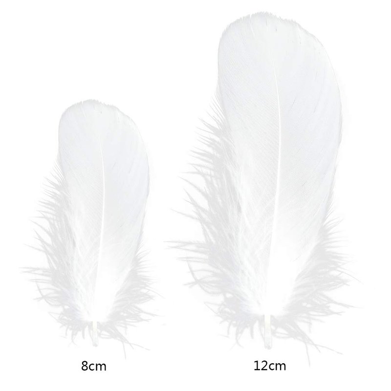 Premium Material: made of natural goose feathers, safe, non-toxic, very comfortable and soft.All feathers are professionally cleaned to perfection. Wide Application: These feathers can be used in many occasion, such as wedding, birthday party, baby shower,art projects, home decorations, costume accessories, gift decoration, ect. Play your imagination, decorated in different places. Specification: Material: natural goose feathers Color: white Size: 8-12cm/3-5inch Quantity: 100 Pcs Warm Note: Due to manual measurement, please allow slight error on size.