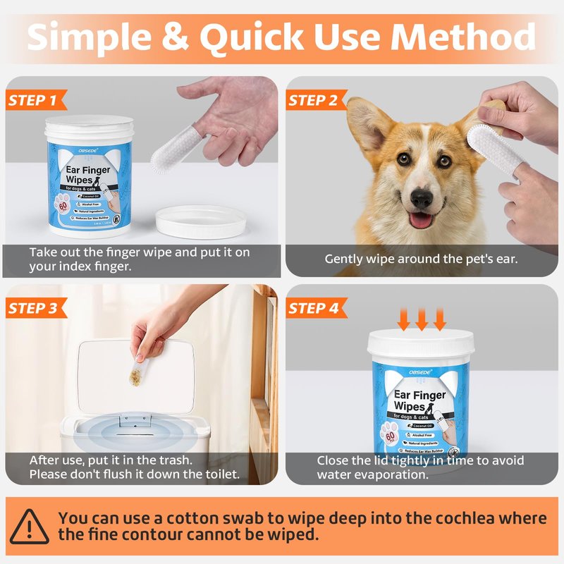 - đăFinger Wipe Design & Easy to UseăConvenient finger wipe design that fits over your fingers. Easy to clean pet's ears and save time, which is comfortable for dogs. Disposable dog ear cleaner gently wipe your pet's ears and throw them in the trash.