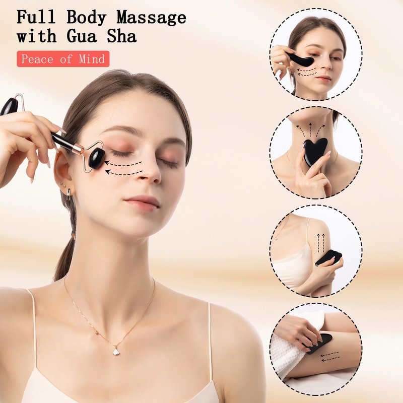 - Exquisite Suit - You will get 4 face massager tools of different styles. Gua sha facial tools target the skin of the face and body; Jade facial rolling relaxes the face and body. Mini gua sha stick can be used for eye and deep tissue massage. This massage tool provides a complete face and body treatment.