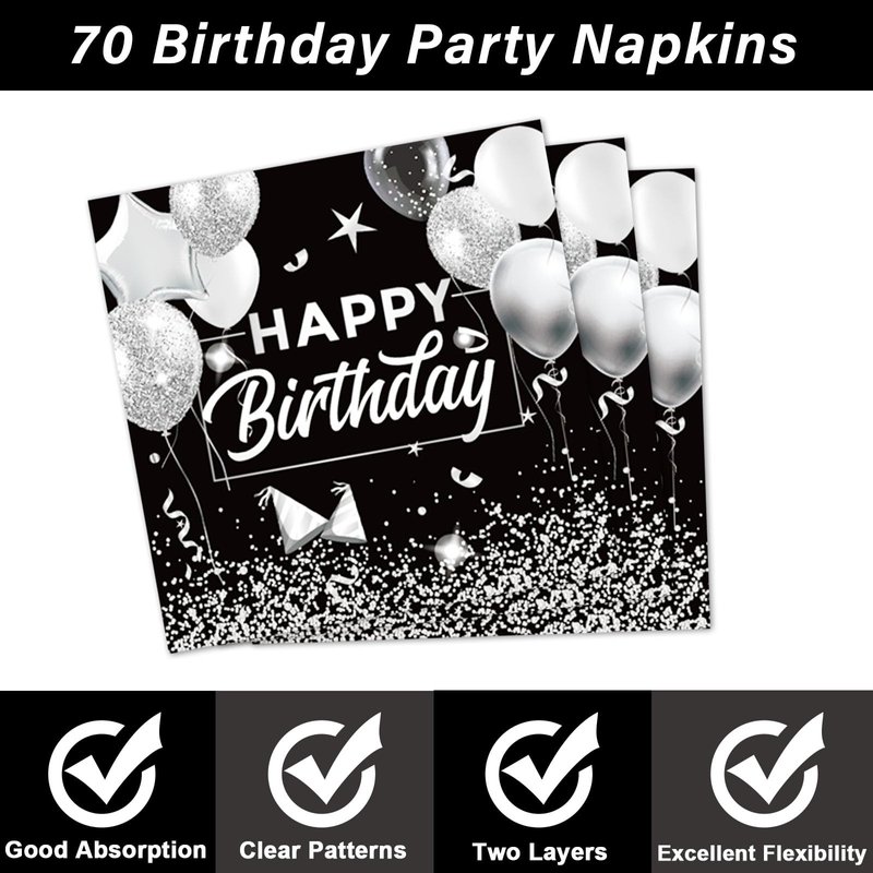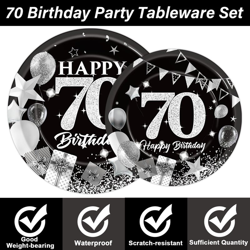 - Save your time: You'll be able to host a 70th happy birthday party that will impress your guests all night long. And when the happy birthday party's over, you can spend more time with your family or friends and less time cleaning up. That's why we designed this black and white silver party tableware set decoration.