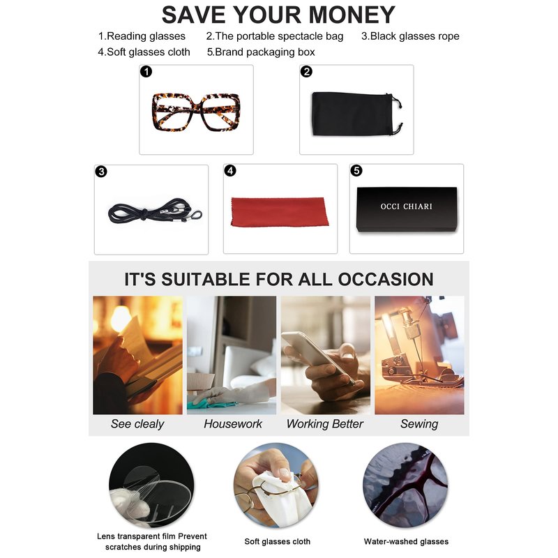 - Package as gift :Not only the portable spectacle bag and soft glasses cloth, but also with a protective cover and lens protection film to avoid scratches during the shipping. comes with a black glasses rope, which can be hung around your neck to avoid losing it during cooking, shopping, walking and fishing.100% replacement or refund service, if any damage occurs to the product, please contact OCCI CHIARIservice team to solve the problem quickly and effectively.