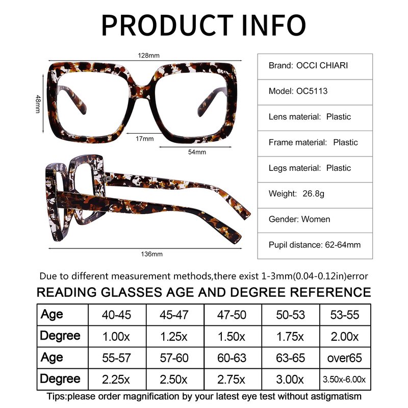 - WEAR FOR LONG TIME:OCCI CHIARI reading glasses using life is more than 3 years after 42356 times of elastic spring leg testing.Oversized frame make people a very expensive feeling(weight 28.6 g)the high elastic spring leg can prevent it clip your face.The nose pads of the glasses fit the bridge of the nose, preventing glasses from slipping and imprinting the skin.The nose pads and hinges are designed to make the glasses not easy to fall off when you are looking down or exercising