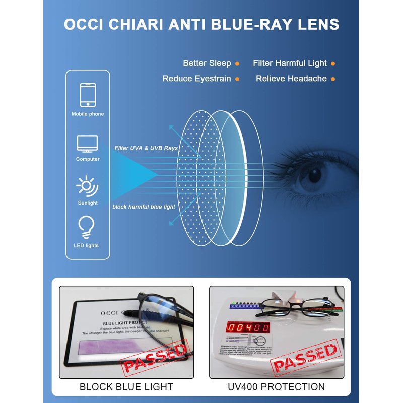 - Anti Blue Light Reading Glasses 175 - High definition blue Light blocker with UV400 protection effectively resist 100% harmful blue rays from digital screen(computer, cellphone, game, TV, etc.) and LED light and sunlight. Obviously reducing eye strain, glare, headache, fatigue, migraine caused from long-term reading / working / gaming.