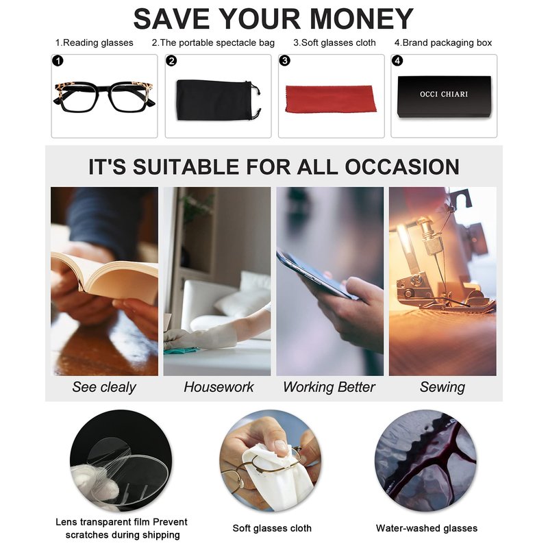 - CLEAR LENS/GOOD MAGNIFICATION:If you aren't able to see the closer things up to u to really see or read clearly, so close to having 20/20, OCCI CHIARI readers are superior glasses you must have,our lense is made of the acrylic lenses,is clear enough. This reading glasses have A-class clear lenses which have higher precision as well ,Use them daily for small print reading,makes the vision clear,give you a very big and sharp view,there are 1.0x, 1.5x, 2.0x, 2.50x 3.0x 3.5x 4.0x 5.0x 6.0x strength
