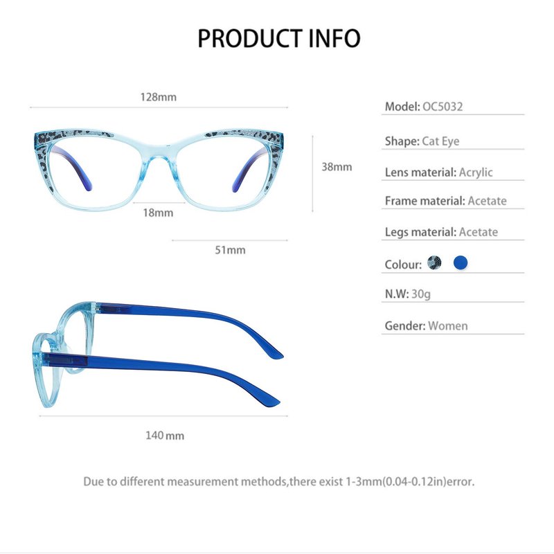 - SIZE & PACKING: Lens width:51mm(2IN), Bridge:18mm(0.71IN), Arm:140mm(5.51IN), Frame width:128mm(5.04IN). Package Included:1*womens readers 6.00, 1*glasses cleaning cloth, 1*black glasses bag (to protect the lens and more convenient to carry), 1*Black original packaging box as a beautiful gift for female.