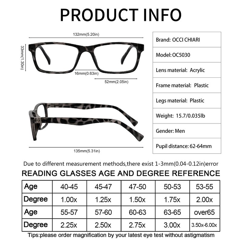 OCCI CHIARI Men Reading Glasses 2.5 Magnifier Readers 1.0 1.25 1.5 1.75 2.0 2.25 2.5 2.75 3.0 3.5 4.0 5.0 6.0