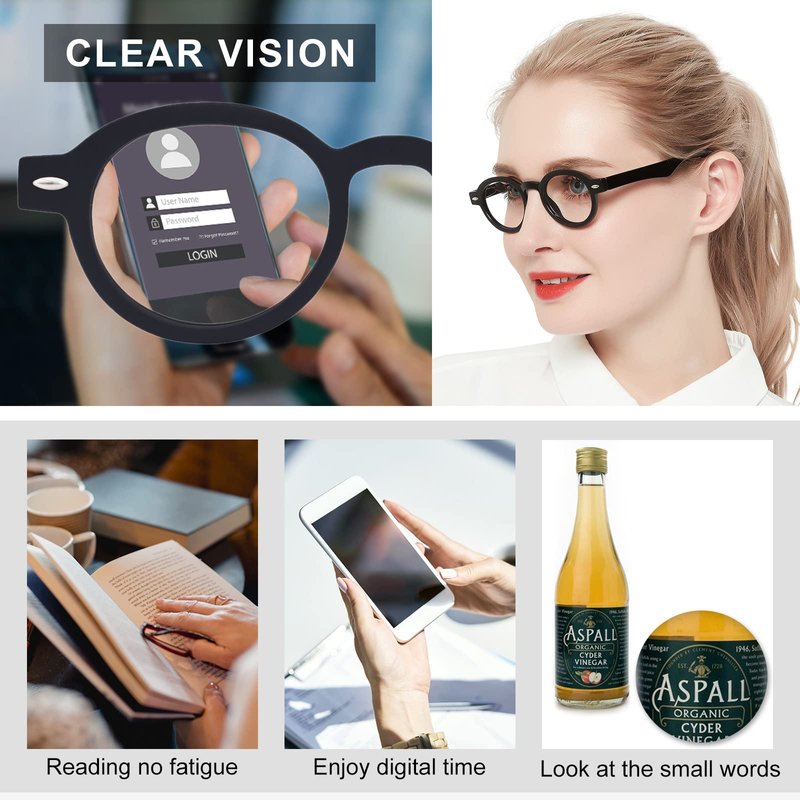 - ENJOY READING AGAIN: If you love to read or spend a lot of time work but have declining vision our round reading glasses for women and men will help you to enjoy these activities again . This reading glasses for women men that will anti eye fatigue when working on a computer,tablet,phone or television.Excellent for relieving visual discomfort, associated with using a phone for long periods time.The fully magnified lens is suitable for people who only wear reading glasses when reading.