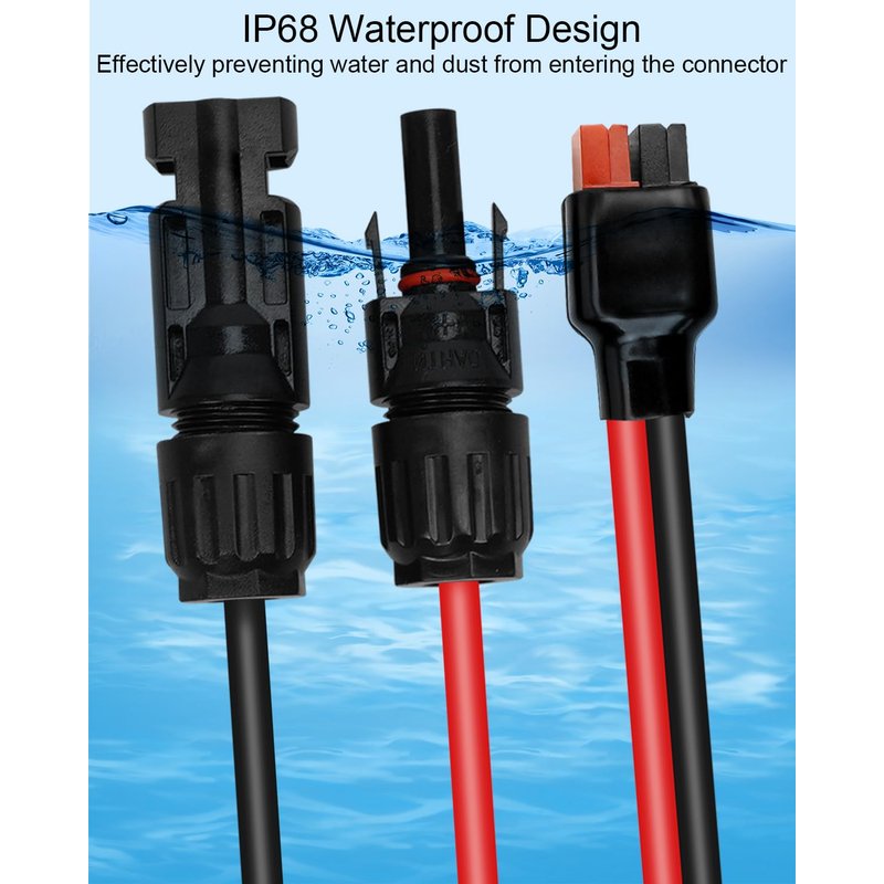 - IP68 Waterproof Design: Solar panel connector cable has excellent waterproof ability, and male plug adopts a sealing ring design, further improving sealing performance, effectively prevent water and dust from entering connector, and can be used normally even in rainy and snowy weather