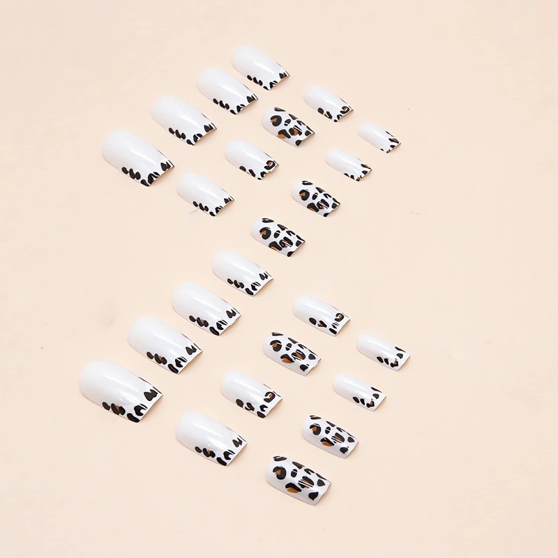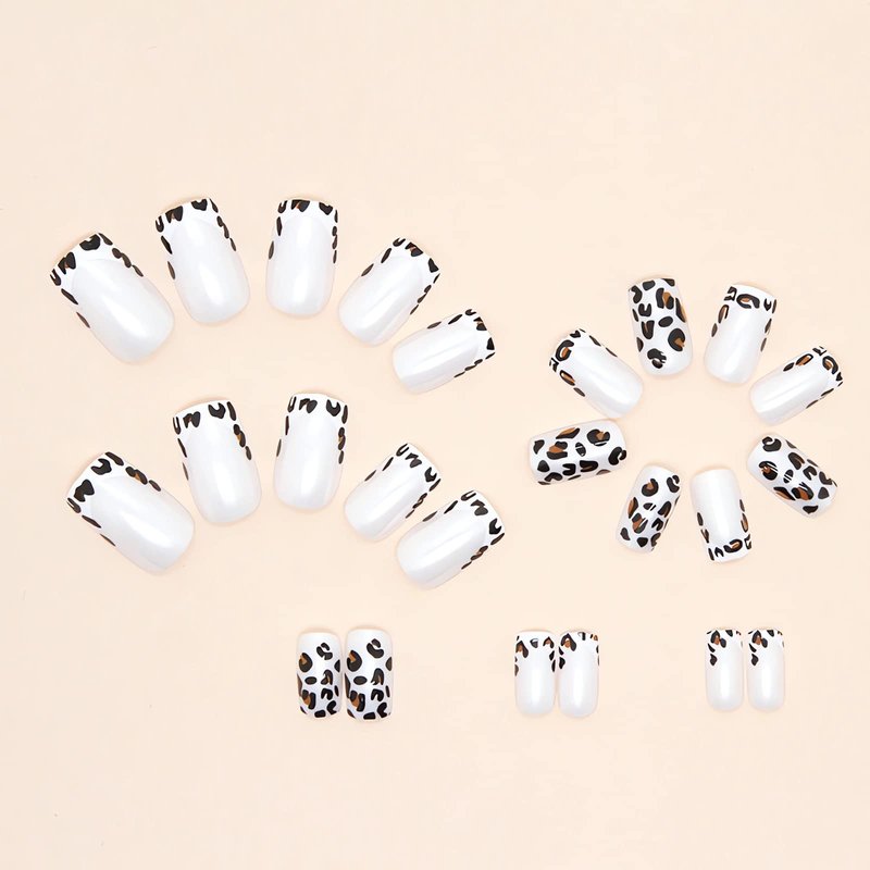 OCOUYVD 24Pcs Leopard Press on Nails Short French Tip Fake Nails Square Acrylic Nails Silvery White Stick on Nails with Designs Glossy French Glue on Nails for Women and Girls Nail Decorations
