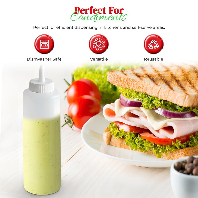 - Perfect for Condiments: These 8-ounce squeeze bottles are ideal for holding a variety of condiments in both kitchens and self-serve areas. Great for ketchup, barbecue sauce, Buffalo sauce, olive oil, and salad dressings, they simplify condiment dispensing in any setting.