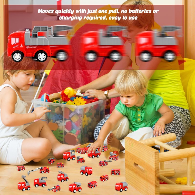 - 【Vehicle Mobility Design】: Small pull back firetruck adopts a pullback mechanism, which can move quickly with a simple pull, no battery or charging required, convenient to use. These mini fire engine trucks are fitted with a classic pullback mechanism. Pull them back, let go, and watch them cruise across the floor.