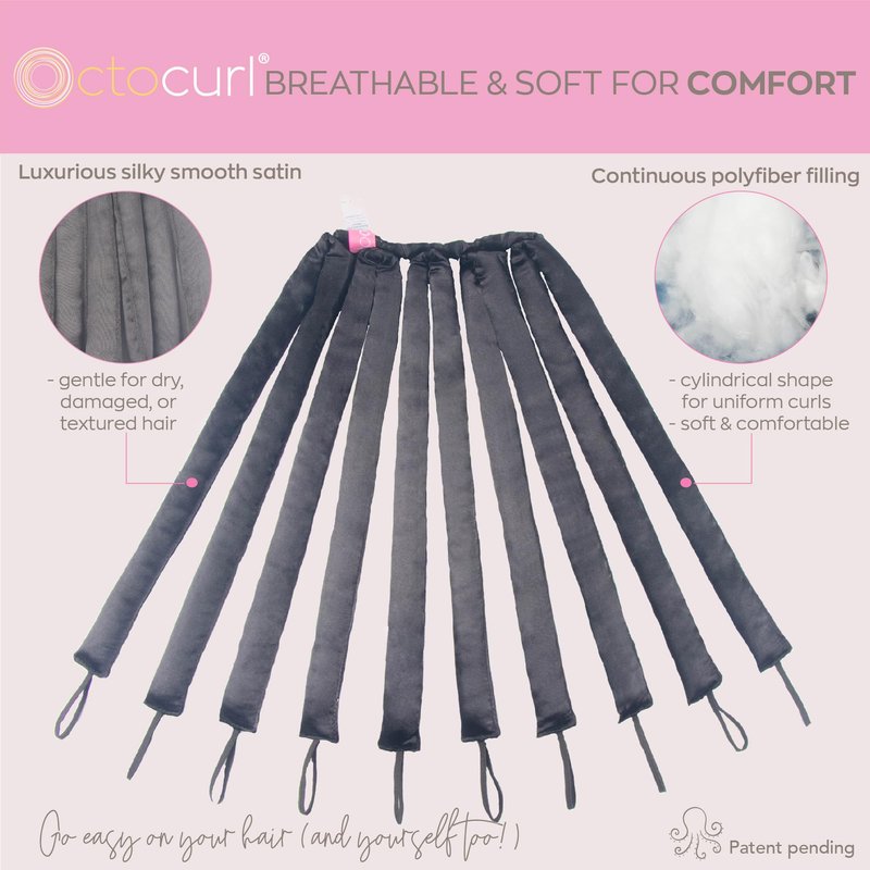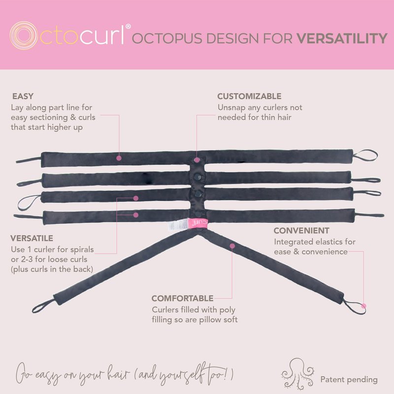 Achieve stunning, silky curls without the damaging heat with the Octocurl Heatless Hair Curler. This innovative curling set features 10 integrated curlers (unsnap any not needed) in a 1-piece easy-to-use design, ensuring long-lasting curls while keeping your hair shiny and healthy. Heatless Curling: Create beautiful curls without any heat damage, preserving your hair's health and shine. Versatile Design: Includes 10 curlers in a 1-piece design, offering endless styling options for all hair types – straight, wavy, textured, natural, and curly. We also offer sizes for short, medium length, and long hair. Customizable Curls: Vary the number of curlers and wrapping methods to achieve different styles. Diagonal wraps with multiple curlers produce looser waves, while horizontal wraps with single curlers create spiral curls. Comfortable & Convenient: Soft and comfortable for overnight curls, allowing you to wake up with a jump start to your morning. Also, ideal for use during the day while relaxing or multitasking. Long-Lasting Results: Allow your hair to dry from damp to completely dry for the strongest curl set. Create effortless, heat-free curls with the Octocurl Heatless Hair Curler. Whether you want loose waves or defined spirals, this curling set provides endless styling possibilities, keeping your hair healthy and beautiful. Transform or maintain the health of your hair by using this versatile heatless styling routine… even alternating to give your hair a break from heat can make a big difference! We created the original octopus hair curlers in 2017 because we wanted heatless curls that lived up to curls from a curling iron. Includes a styling booklet, and tutorials are available on our website and social media. Go easy on your hair (and yourself, too)!