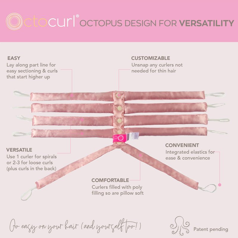 Achieve stunning, silky curls without the damaging heat with the Octocurl Heatless Hair Curler. This innovative curling set features 10 integrated curlers (unsnap any not needed) in a 1-piece easy-to-use design, ensuring long-lasting curls while keeping your hair shiny and healthy. Heatless Curling: Create beautiful curls without any heat damage, preserving your hair's health and shine. Versatile Design: Includes 10 curlers in a 1-piece design, offering endless styling options for all hair types – straight, wavy, textured, natural, and curly. We also offer sizes for short, medium length, and long hair. Customizable Curls: Vary the number of curlers and wrapping methods to achieve different styles. Diagonal wraps with multiple curlers produce looser waves, while horizontal wraps with single curlers create spiral curls. Comfortable & Convenient: Soft and comfortable for overnight curls, allowing you to wake up with a jump start to your morning. Also, ideal for use during the day while relaxing or multitasking. Long-Lasting Results: Allow your hair to dry from damp to completely dry for the strongest curl set. Create effortless, heat-free curls with the Octocurl Heatless Hair Curler. Whether you want loose waves or defined spirals, this curling set provides endless styling possibilities, keeping your hair healthy and beautiful. Transform or maintain the health of your hair by using this versatile heatless styling routine… even alternating to give your hair a break from heat can make a big difference! We created the original octopus hair curlers in 2017 because we wanted heatless curls that lived up to curls from a curling iron. Includes a styling booklet, and tutorials are available on our website and social media. Go easy on your hair (and yourself, too)!