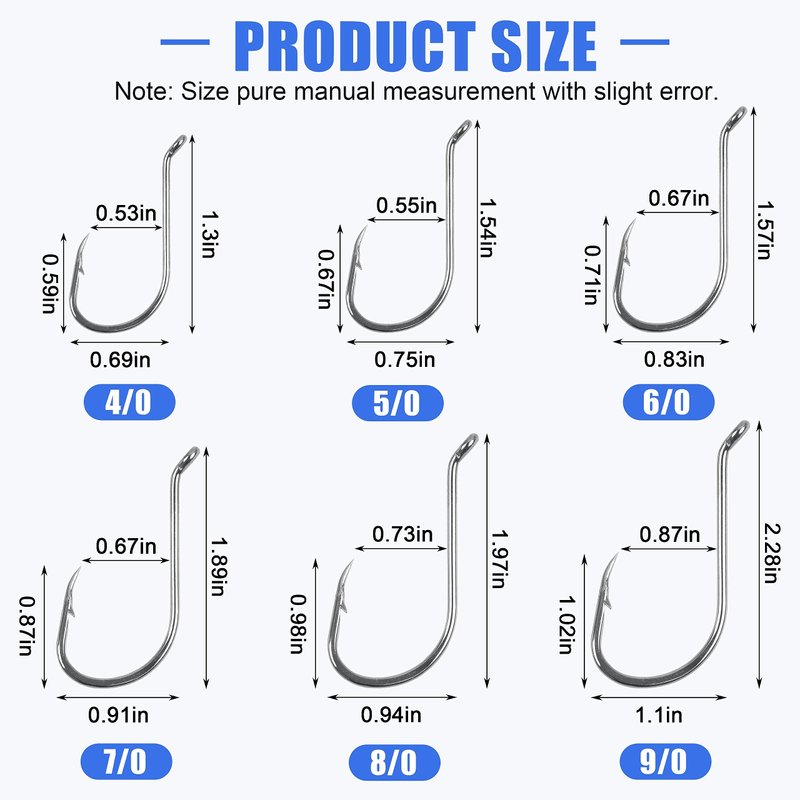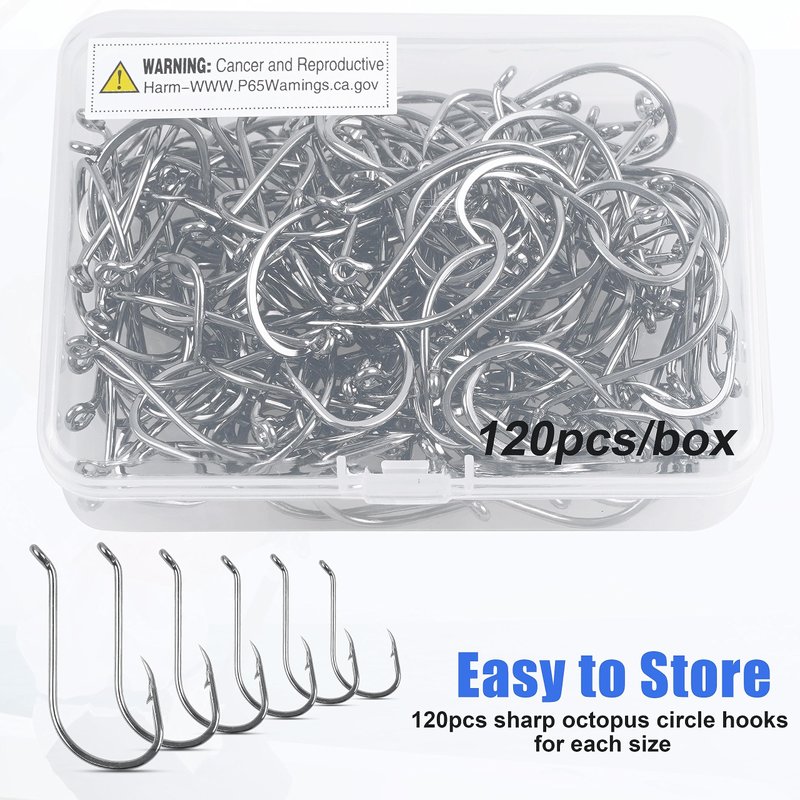 - Size: 2#, 4#, 6#, 8#,1/0, 2/0, 3/0, 4/0, 5/0, 6/0, 7/0, 8/0, 9/0,120pcs sharp octopus circle hooks for each size