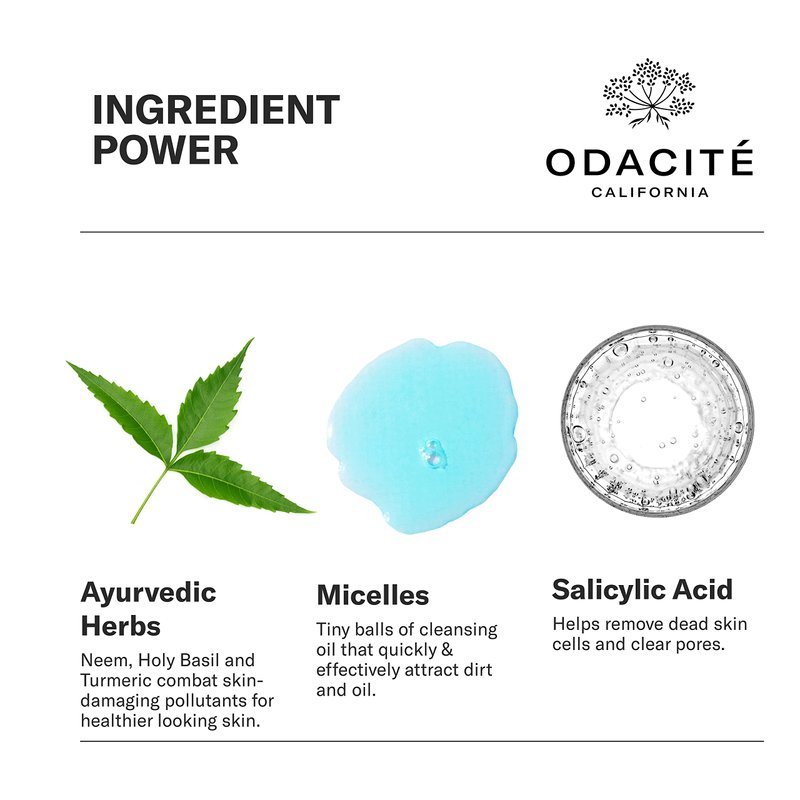 - Ingredient Power: Aloe Vera hydrates and soothes, Micelles serve as a dirt and oil magnet, Salicylic Acid creates clear-looking pores, Holy Basil and Neem are anti-pollution Ayurvedic herbs, Turmeric provides antioxidant power, and Grapefruit is a refreshing astringent.