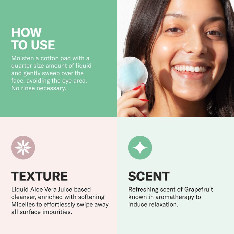 - Application Uses & Tips: Moisten a cotton pad and gently sweep over the face, avoiding the eye area. No rinse necessary.