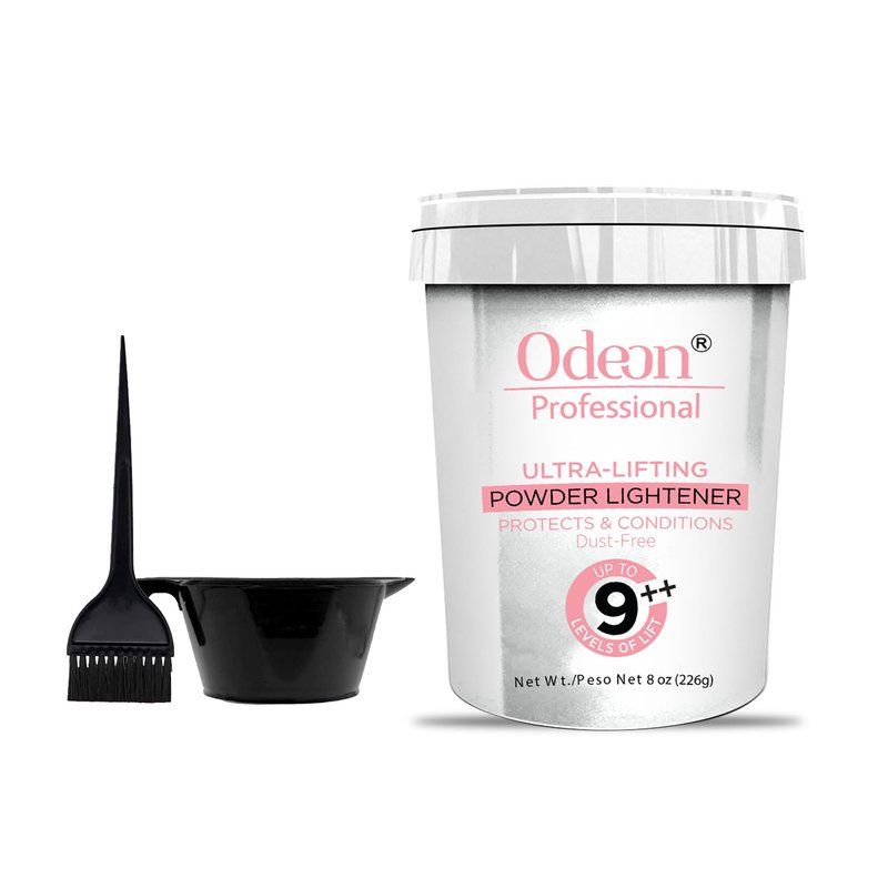 Odeon Professional Ultra-Lifting Powder. This advanced formula lifts hair color up to an extraordinary 9++ level while nourishing agents protect hair integrity. The convenient kit includes a mixing bowl and dye brush for precise application. Versatile for various techniques, it ensures professional-quality results whether you're aiming for subtle highlights or bold transformations. Minimize mess and maximize brilliance with Odeon.