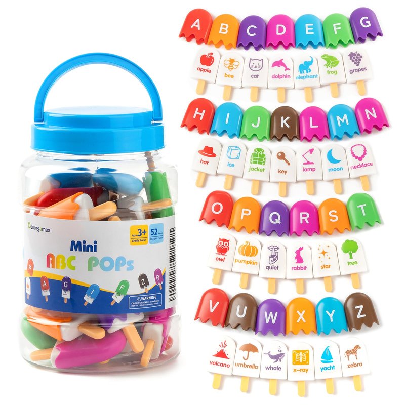 Experience the joy of learning letters with Odoorgames ABC Pops - an interactive alphabet learning toy designed specifically for preschoolers and kindergarteners. Dive into the world of letters from A to Z and unlock the popsicle shells to discover beautifully illustrated vocabulary with matching initial letters. Not only are these popsicles engaging, but they also offer a fun fine motor experience. The easy-to-pop shells aid in the development of hand strength, coordination, and other essential fine motor skills. Your little ones will exercise their hands while enjoying the thrill of letter recognition and matching. After a day of letter exploration, simply store these sweet popsicles in the reusable jar until the next playtime. This ensures they stay organized and ready for more learning adventures. In addition to letter exploration, our alphabet learning toys also promote color recognition. With a set of 7 vibrant colors, including red, yellow, blue, green, purple, pink, and brown, children can learn colors while immersing themselves in the exciting world of letters and words. Our alphabet manipulatives are a must-have for preschool and kindergarten classrooms. Whether children are learning to read, mastering phonics, or exploring early letters A-Z, our toys and games build confidence and lay a solid foundation for future learning. Trust Odoorgames for your alphabet learning toy needs, and embark on a journey of letter discovery and fun. Get your ABC Pops today and create a captivating learning experience!
