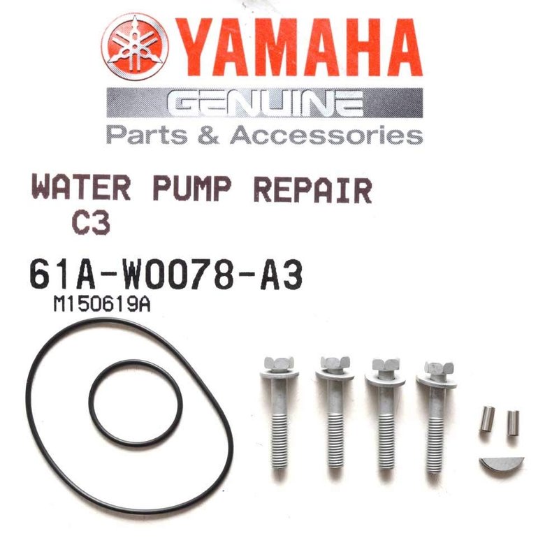 Yamaha PN: 61A-W0078-A4-00 Includes: Impeller Wear Plate Woodruff Key Water Pump Gasket O-Rings Bolts and other hardware Fits Most: F150, F200, F225 (1992-)225,250 S150, SX150, S200, SX200, S250, SX250 V150-V250, VX150-VX250 VZ150-VZ200 (2.6L), Z150-Z300 (1997-1999)P150-P200,C150, (1999) PX150