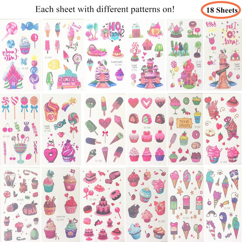 - Super Fun & Vivid Dessert Tattoos Designs: Comes with 18 sheets of temporary tattoos, each with different patterns on. Variously super fun and cute designs will definitely be a big hit with birthday parties or any other party or holiday events