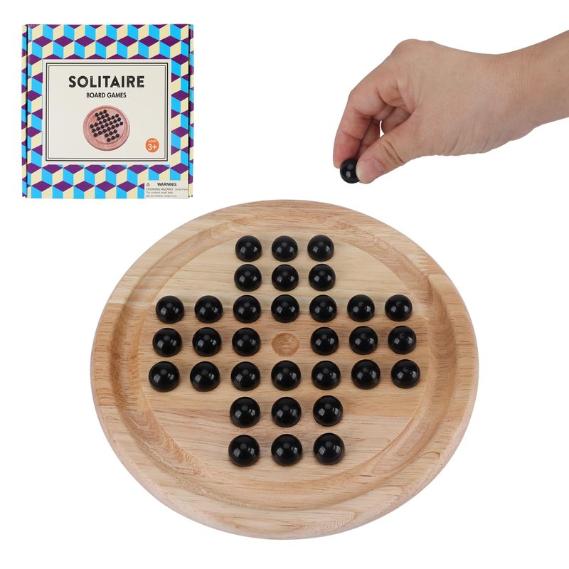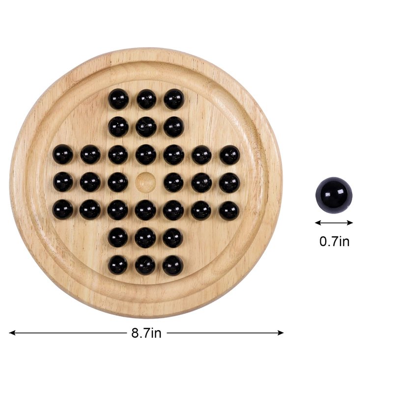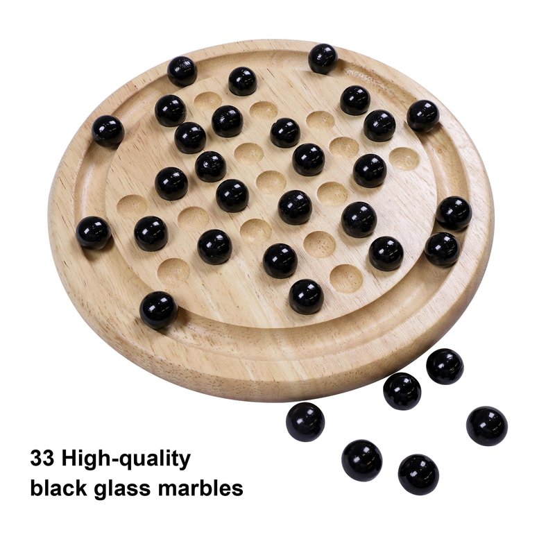 - 【Wooden Marble Soltaire Board Game】: A great tabletop game, family games and camping games.This set features a wood board, which holds black glass marbles. Groove around the outer edge to hold the marbles when removed from play