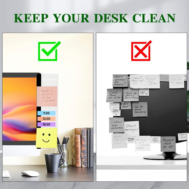 - 💌NOTE: Acrylic post it note holder can not be directly pasted on the computer screen, because the adhesive force of the computer sticky note holder is very strong. Please pasted on the black edge of the screen, otherwise, the screen will be damaged. Narrow edges are not recommended!!! If you are not satisfied with our products, or if the products are damaged during transportation. Please contact us on time and we will solve the problem for you for the first time.