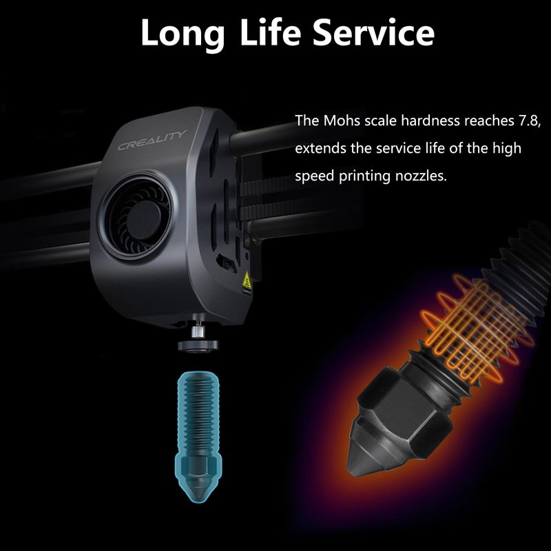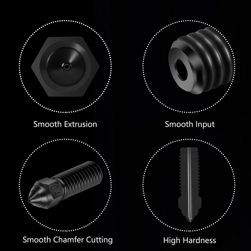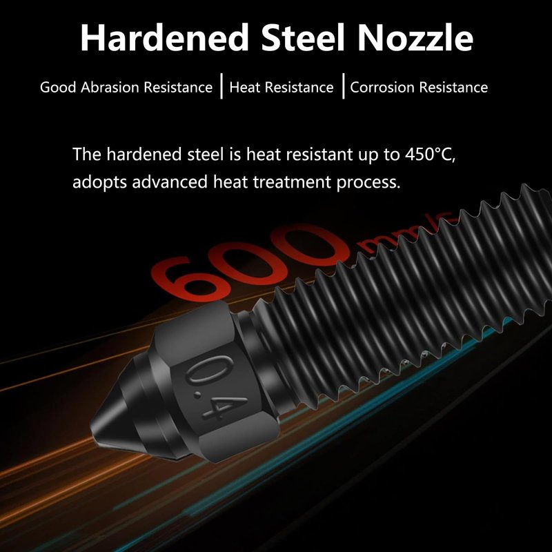 - Premium Performance - The hardened steel is heat resistant up to 450°C, which adopts advanced heat treatment process, and the Mohs scale hardness reaches 7.8, which extends the service life of the high speed printing nozzles.